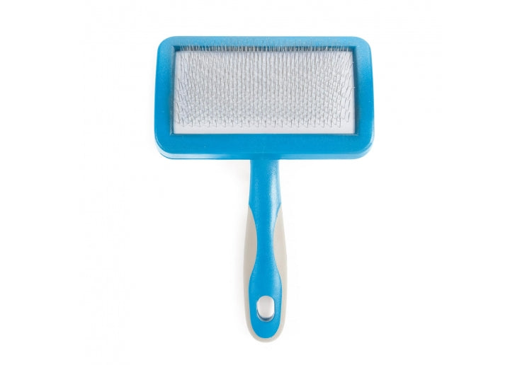 To use the slicker, slowly and gently brush the hair in the direction of the fur growth. The bendy pins will pull away loose hairs leaving a smooth and neat coat. If your dog is comfortable with the slicker, press gently on the tool to remove more fur from the undercoat. The pins of the slicker are bendy to prevent discomfort, however, do not press them into your dog's skin. To remove a tangle, isolate the fur and gently pull the slicker through the tangle, starting fro from the outside and working in as the fur de-tangles. To ensure your dog has an enjoyable grooming session, start gently. Pause or end the grooming session if your dog becomes agitated.