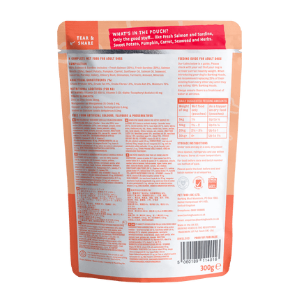Composition: 85% Salmon & Sardine includes – Fresh Salmon (30%), Fresh Sardine (30%) Salmon Broth (25%), Sweet Potato, Pumpkin, Carrot, Sunflower Oil, Salmon Oil, Seaweed, Lucerne, Parsley, Celery, Chicory Root, Cinnamon, Turmeric, Aniseed, Minerals