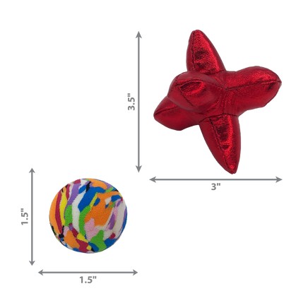 KONG Cat Active Jacks toss 3 toys into play with kitty-tempting spins on traditional fun in super lightweight toys that spark action. Fast-rolling, bouncy balls and easy-to-flip jack invite pouncing and batting play. KONG North American Premium Catnip and crackle in shiny Jack prolong engagement for tons of healthy exercise.