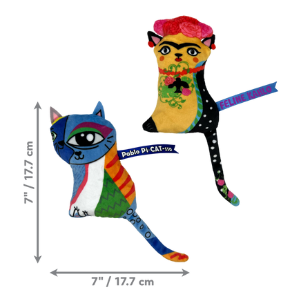 KONG Artz Cats are miniature masterpieces inspired by cats and world-famous artists. Now your cat can have an artist duo of their own—to cuddle with Feline Kahlo and pounce on Pablo Pi-CAT-sso. These crackling little works of art, filled with KONG Premium North American Catnip, each with a tail and ribbon for enticing chasing and swatting, will keep your cat batting, pouncing, and snuggling.