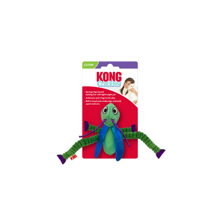 KONG Crackles Grasshopper’s springy legs and lightweight body make him ideal for batting and pouncing for tons of instinct-satisfying fun. A bell inside this grinning hopper’s head and crinkly wings keep cats playing while KONG North American Premium Catnip inside promotes play. Irresistible antennae and shiny wings invite batting.