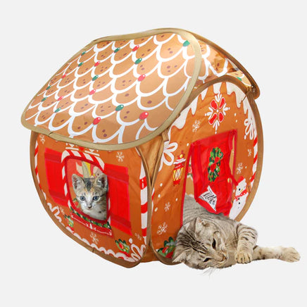 An ideal place for cats to curl up and hide, this gingerbread bungalow retreat, features a springy present for batting and Christmas decorations that will make the neighbors want to cuddle in.