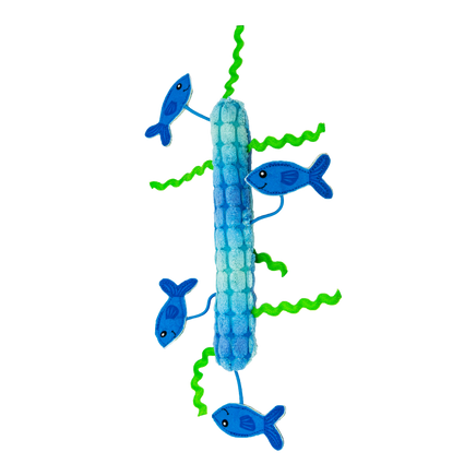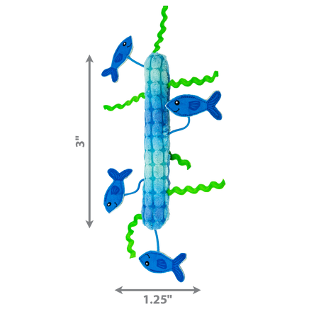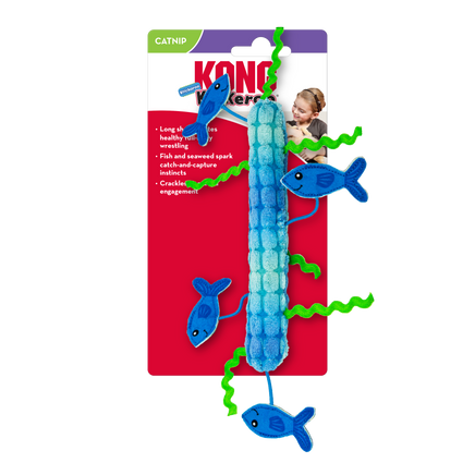 KONG Kickeroo Stickeroo delivers multi-sensory enrichment in a long soft, shape that encourages healthy full-body wrestling and hind paw kicking. Squiggly seaweed and a school of eye-catching shiny fish tethered with elastic invite dynamic batting and pouncing for “undersea” adventures. They’re also great for rewarding catch and capture instincts. Crackle sounds and KONG Premium North American Catnip throughout the stick encourage natural, satisfying fun with every move.