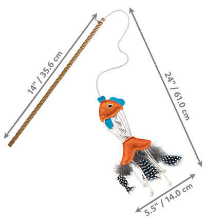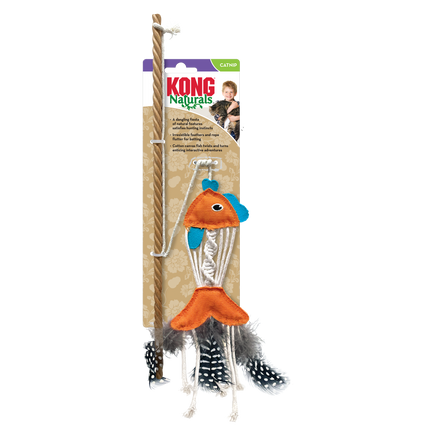 KONG Naturals Teaser Fish lures cats to play with a dangling fiesta of natural features that satisfy hunting instincts. Feathers flutter irresistibly for batting, the cotton canvas fish twists and turns for grabbing and dangling cotton rope strands spark pouncing. The twisted wood wand enhances the action, maximizing healthy exercise. KONG North American Premium Catnip in head and tail keeps this fishing expedition going.