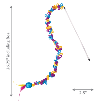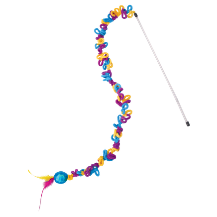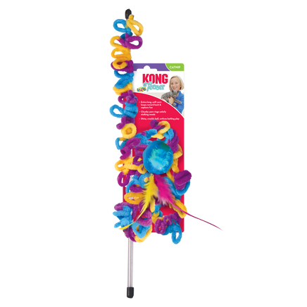 KONG Teaser Loopz has an extra-long wand and soft yarn rings that satisfy hunt and capture instincts. The chunky yarn rings provide a fulfilling reward while meeting stalking needs. A shiny ball and fluttery feathers give kitties an exciting visual target for pouncing while the ball’s crackling sound keeps cats interested. KONG North American Premium Catnip in the ball boosts mood, to keep kitties playing longer.
