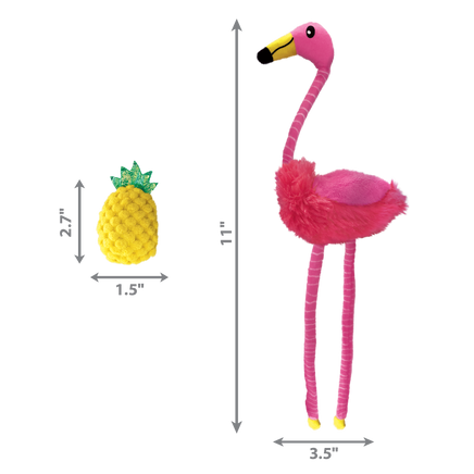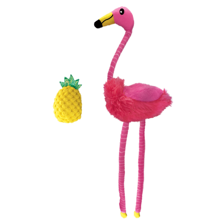 KONG Cat Tropics Flamingo’s two toys double the fun while extending the ways a cat can play. The flamingo’s long legs and neck invite drag-and-capture fun, crackling to extend the instinct-satisfying action. A lightweight pineapple entices and rewards batting fun. KONG North American Premium Catnip in both toys keep the tropical action going.