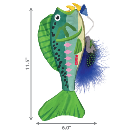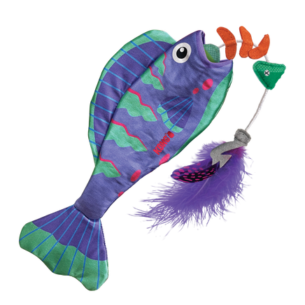 KONG Wrangler Angler’s feathery lure temps cats to grab…and when they do, the elastic line line pulls out fish bones for a filet of fun that satisfies natural instincts. The bones snap back inside for endless play, prolonged by KONG North American Premium Catnip and crinkles in the fish body. This long, eye-catching, shiny toy invites healthy full-body wrestling.