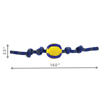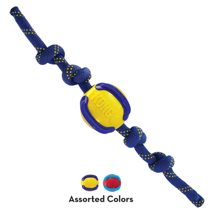 KONG Jaxx™ Brights Ball with Rope has durable materials and is built for long-lasting tugging fun. The unique construction features a ball and knotted rope that satisfies instinct rewarding interactive playtime. The sturdy rope adds flexibility for dynamic interactive play sessions and is squeaker free for moments of quiet engagement. This toy is built to delight multiple play needs and stands the test of time.