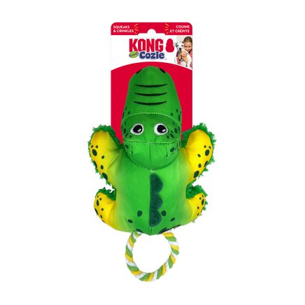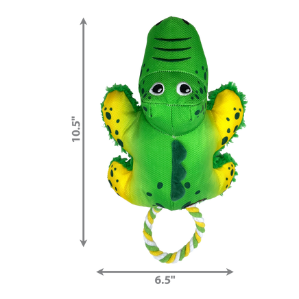 Cozie Tuggz Gator’s rope handle is made from sturdy cotton rope knotted inside his body for instinct-satisfying tugging action. He squeaks and crinkles to keep the fun going for lots of healthy interactive play. Soft plush fur invites soothing snuggles between bouts of tug-of-war.