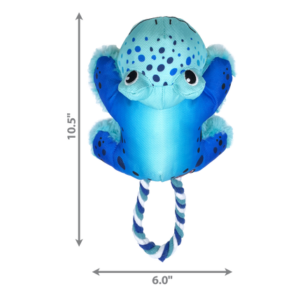 Cozie Tuggz Frog’s rope handle is made from sturdy cotton rope knotted inside his body for instinct-satisfying tugging action. He squeaks and crinkles to keep the fun going for lots of healthy interactive play. Soft plush fur invites soothing snuggles between bouts of tug-of-war