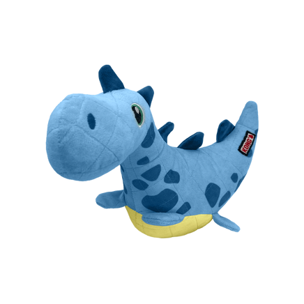 KONG Dynos Roars’ round bellies help them roll and spin on the ground, eye-catching actions that entice dogs into Jurassic adventures of fetching and tugging. An oversized squeaker sparks hunting instincts and prolongs prehistoric play. Their plush hides are lined and cross-stitched for long-lasting indoor fun.