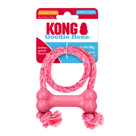The KONG Puppy Goodie Bone™ with Rope engages puppies that delight in chew sessions, while the all-natural cotton rope making it an ideal toy to fulfill a puppy's instinctual needs. Made from the KONG Classic unique a puppy rubber, this bone teaches puppies appropriate chewing behavior while easing aching teeth and gums. It also has the added delight of an all-cotton rope that gives puppies multiple chewing choices.