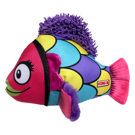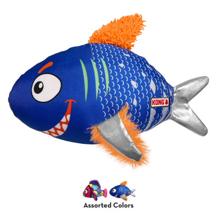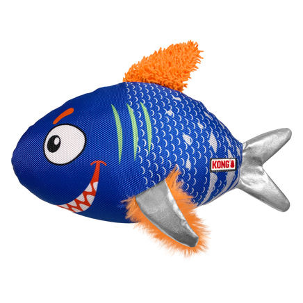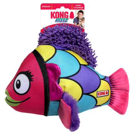 KONG Reefz sport multiple textures that reward instinctual chewing behaviors. The durable KONG Ballistic material and flat, floppy bodies spark thrashing fun. Squeakers make sure dogs take the bait and keep playing with their irresistibly shiny aquatic friends.