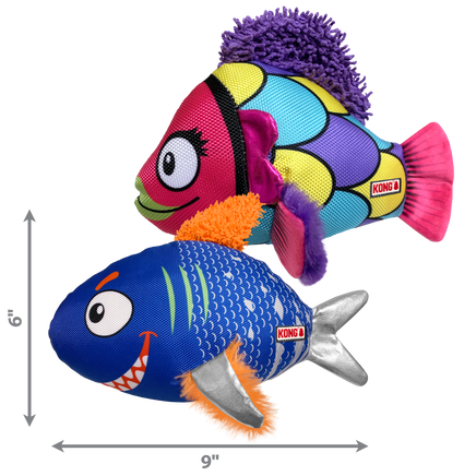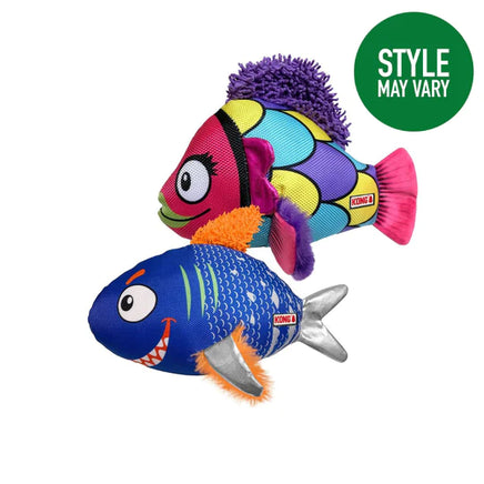 KONG Reefz sport multiple textures that reward instinctual chewing behaviors. The durable KONG Ballistic material and flat, floppy bodies spark thrashing fun. Squeakers make sure dogs take the bait and keep playing with their irresistibly shiny aquatic friends.