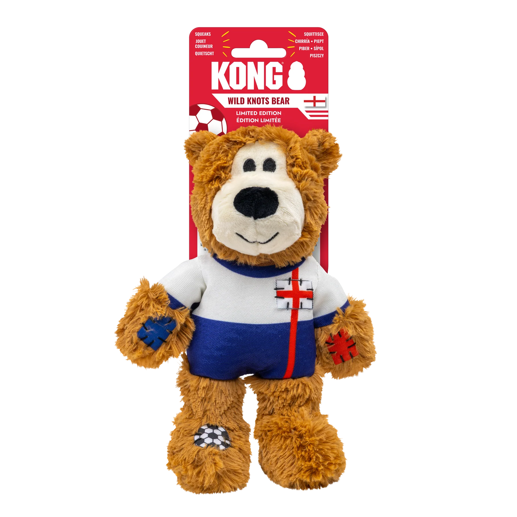 KONG Wild Knots World Cup Sports Medium Bears are limited-edition dog toys featuring a soft, plush exterior, an internal knotted rope skeleton, and a squeaker. Designed for tugging, thrashing, and chewing, these toys are themed around football (soccer) with uniforms from various countries, including England, Portugal, and Brazil, plus a referee design.