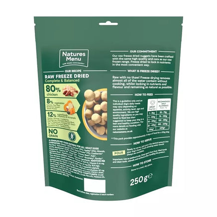 Natures Menu complete and balanced 80:20 Freeze Dried chicken dog food. The ideal solution to on the go feeding when raw isn’t practical. Ensuring your dog still gets the same taste and quality of raw in a Freeze Dried alternative. Its raw without the thaw!