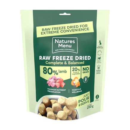 Natures Menu complete and balanced Freeze Dried lamb dog food. A mouthwatering combination of tender lamb, fruits and vegetables with delicious superfoods.