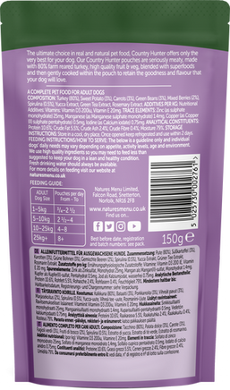 Super meaty wet food, made with 80% farm-reared turkey blended with a nutritious selection of fruits and vegetables. Grain free, chicken free and low fat. Complete and balanced. Pack size: 6 x 150g