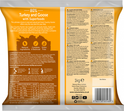 Delicious meaty nuggets made with 80% turkey and goose blended with a nutritious combination of wholesome superfoods. Complete and balanced. Chicken free. Grain Free. Pack size 1kg.