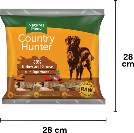 This delicious mix of quality meats rich in amino acids and with natural omegas 3 & 6 is blended with swede, carrots and peas, plus redcurrants, which provide a healthy helping of vitamins C & K. We never use meat derivatives or meat meals, and this frozen turkey dog food with goose and added superfoods is naturally gentle on digestion, and perfect for dogs prone to stomach sensitivities.Quality is our watchword, so we only ever use responsibly sourced, human grade meat and all of our nugget dog food – in fact all our dog food – comes with veterinary approval and is made to FEDIAF guidelines. This raw nugget dog food is a great way to switch to raw. Simply pour out the number of nuggets you need, let them defrost, then serve. This complete and balanced frozen turkey dog food is suitable for dogs from 20 weeks of age and may contain small bones (4g in every 100g).