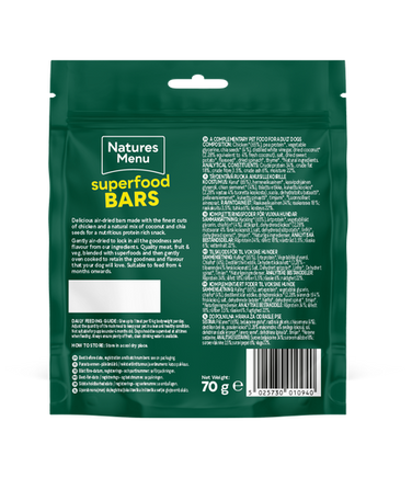 Delicious air-dried bars made with the finest cuts of chicken and a natural mix of coconut and chia seeds. Enriched with extra fruits, vegetables and superfoods for a perfect healthy snack. Individual pack size 70g. Suitable to feed from 4 months onwards.