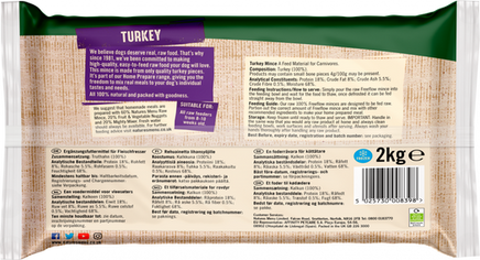 High quality, raw, minced turkey in an easy to prepare, free-flowing frozen format. 100% natural and packed with goodness. Product may contain small bone pieces 4g/100g may be present. Pack size 2kg