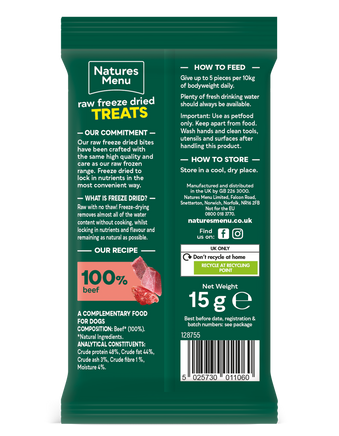 Our bites have been crafted with the same high quality and care as our raw frozen range – they're approved by our in-house experts and are made according to FEDIAF guidelines. Freeze-dried to lock in nutrients. Give up to five pieces per 10kg of body weight daily.