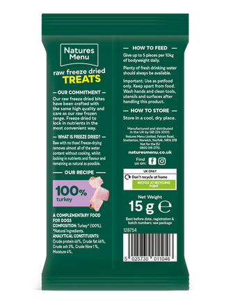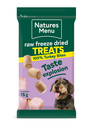 These delicious raw, freeze-dried treats made with 100% raw turkey are ideal as training or occasional treats.