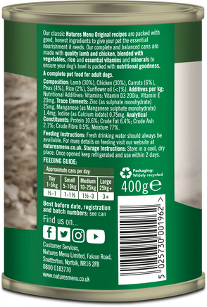 Flavoursome lamb with chicken, vegetables and wholegrain rice make this fulfilling natural meal for adult dogs and puppies over 20 weeks of age. Complete and nutritionally balanced goodness in a can.