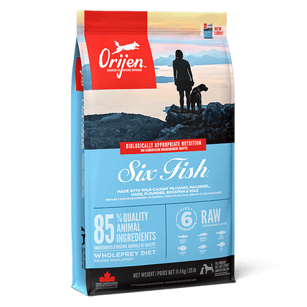 Help your dog thrive with the power of protein-rich recipes that provide peak nourishment. Dogs are ancestral carnivores, so they need a Biologically Appropriate diet rich and varied in whole animal ingredients. ORIJEN™ Six Fish diet is made with a variety of succulent fish including raw* wild-caught pilchard, mackerel, hake, flounder, rockfish and sole. Packed with WholePrey animal ingredients like organs and bone, ORIJEN food is made with the most nutrient-dense, succulent parts of the prey to deliver the nutrition dogs need. With 85%** quality fish ingredients and a freeze-dried liver coating, this diet is beyond comparison.