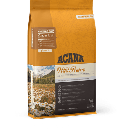 Featuring free-run chicken and turkey, and cage-free eggs, from vast Canadian prairies, and wild-caught fish from our pristine lakes, ACANA Wild Prairie is brimming with 70% meat, organs, cartilage, and bone, giving your dog everything they need for peak health, in their most natural and nourishing form. Our ingredients are delivered to our kitchen fresh or raw by people we know and trust, for a recipe that is richly nutritious and delicious, keeping your dog happy, healthy, and strong.