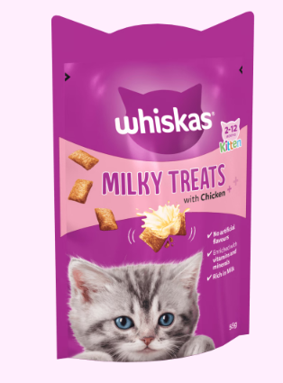 WHISKAS® Milky Treats are small, yummy, dual-textured treats, perfectly designed for little mouths. With a scrumptiously soft, creamy centre that is rich in milk, a source of calcium, our kitten treats also help support the growth of healthy teeth and bones. Happy purrs all round!