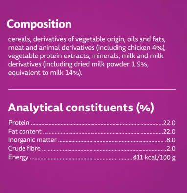 Cereals, Derivatives of Vegetable Origin, Oils and Fats, Meat and Animal Derivatives (including Chicken 4%), Vegetable Protein Extracts, Minerals, Milk and Milk Derivatives (including Dried Milk Powder 1.9%, equivalent to Milk 14%)