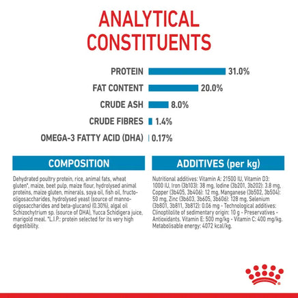 Analytical constituents: Protein: 31% - Fat content: 20% - Crude ash: 8% - Crude fibres: 1.4% - Omega-3 fatty acid (DHA): 0.17% - Vitamin E: 500 mg/kg, Vitamin C: 400 mg/kg. Metabolisable energy: 4072 kcal/kg.