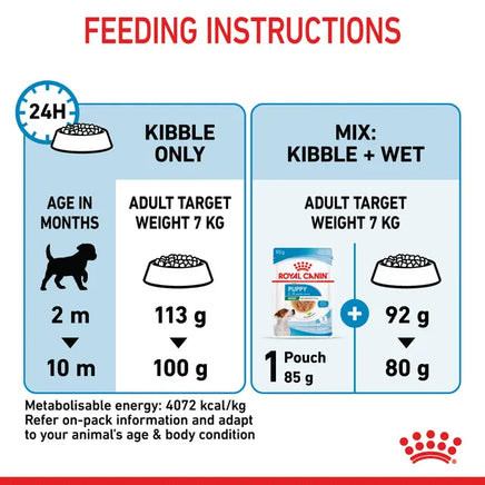 Small breed puppies grow very fast. During their intense growth period, they need enough calories and the right nutrients to grow healthily. This is a time when your puppy's bones, muscles, senses and nervous system are developing. It's also the period when the antibodies your puppy got from their mother's colostrum weaken, meaning they need optimal protein to build their own immune system. ROYAL CANIN® Mini Puppy is specially formulated to support the nutritional needs of small breed puppies. This formula is suitable for 2 to 10-month-old puppies that should reach an adult weight of 4-10kg. This tailored diet is enriched with omega-3 fatty acids (such as DHA) to help support healthy brain development in puppies. The formula also contains an optimal energy content designed to satisfy the high energy needs of fast-growing, small breed puppies. This formula also contains nutrients such as vitamins C and E that help support the puppies' natural defences. Thanks to a combination of beneficial prebiotics (such as FOS, MOS and beet pulp) and highly digestible proteins, ROYAL CANIN® Mini Puppy also helps to support a healthy balance of intestinal microbiota (gut flora) for good digestion. The kibble in ROYAL CANIN® Mini Puppy has also been specially designed for your puppy's small jaw, making it easy for them to pick up and chew. It also helps to support dental health, thanks to a mechanical brushing effect as your puppy chews. Did you know that a puppy's nutritional needs change as they grow? By the time your puppy reaches 10 months old, they will need a diet that's specially adapted to meet their nutritional needs as a grown dog. At this stage, you can transition them onto ROYAL CANIN® Mini Adult, available either as a dry kibble diet or with wet chunks in gravy. At Royal Canin, we're committed to creating a better world for cats and dogs. For more than 50 years, we've worked closely with breeders, vets, and pet experts, sharing specialist knowledge and scientific research to create a dedicated approach to individualised, precise nutritional solutions. All of our products undergo an extensive quality control process to guarantee the optimal quality of food. When your small breed puppy eats ROYAL CANIN® Mini Puppy, they're getting a complete and balanced diet.