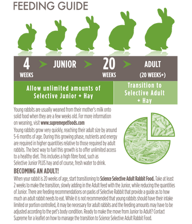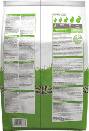 Selective Rabbit Junior is best fed freely, however weight & wellbeing should be regularly monitored. Allow 40-50g/kg of bodyweight per rabbit per day. Fresh vegetables should also be provided along with good quality hay and clean drinking water. Please store in a cool dry place.