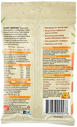 Nibblots have been formulated to maintain small animals wellbeing. Suitable for the following breeds: Rabbits, Guinea Pigs, Hamsters, Rats, Mice. Each treat is comprised of a delicious crispy cereal shell containing a cream filled fruity centre with Omega 3 and vitamins to help promote healthy skin and coats. Help to promote bond between pet and owner.