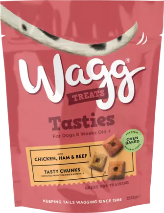 A complementary pet food for all dogs 8 weeks and over. Meaty square-shaped chunks with chicken, ham and beef, enriched with vitamins and minerals for a seriously tasty treat.