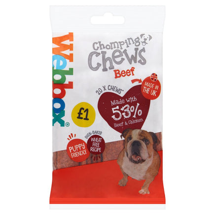 Made with 50% fresh meat, our Beef Chomping Chews are wheat and gluten free, so they’re ideal for dogs with allergies. At Webbox, we don’t like artificial colours in our food, so we haven’t included them in our Chomping Chews.