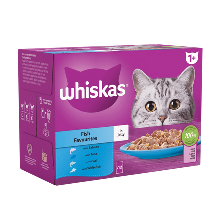 With Salmon Analytical constituents (%): Protein: 7.8, Fat content: 4.0, Inorganic matter: 1.6, Crude fibre: 0.25, Moisture: 84.5, Additives per kg:, Nutritional additives:, Vitamin C: 702 mg, Vitamin D₃: 200 IU (Vitamin D₃ not supplemented in salmon and tuna varieties), Taurine: 620 mg, Copper (Copper(II) sulphate pentahydrate): 1.2 mg, Iodine (Calcium iodate, anhydrous): 0.22 mg, Iron (Iron(II) sulphate monohydrate): 11.2 mg, Manganese (Manganous sulphate, monohydrate): 2.2 mg, Zinc (Zinc sulphate, monohydrate): 16.2 mg, Technological additives:, Cassia gum: 2148 mg, Sensory additives:, Flavourings With Tuna Analytical constituents (%): Protein: 7.8, Fat content: 4.0, Inorganic matter: 1.6, Crude fibre: 0.25, Moisture: 84.5, Additives per kg:, Nutritional additives:, Vitamin C: 702 mg, Vitamin D₃: 200 IU (Vitamin D₃ not supplemented in salmon and tuna varieties), Taurine: 620 mg, Copper (Copper(II) sulphate pentahydrate): 1.2 mg, Iodine (Calcium iodate, anhydrous): 0.22 mg, Iron (Iron(II) sulphate monohydrate): 11.2 mg, Manganese (Manganous sulphate, monohydrate): 2.2 mg, Zinc (Zinc sulphate, monohydrate): 16.2 mg, Technological additives:, Cassia gum: 2148 mg, Sensory additives:, Flavourings With Whitefish Analytical constituents (%): Protein: 7.8, Fat content: 4.0, Inorganic matter: 1.6, Crude fibre: 0.25, Moisture: 84.5, Additives per kg:, Nutritional additives:, Vitamin C: 702 mg, Vitamin D₃: 200 IU (Vitamin D₃ not supplemented in salmon and tuna varieties), Taurine: 620 mg, Copper (Copper(II) sulphate pentahydrate): 1.2 mg, Iodine (Calcium iodate, anhydrous): 0.22 mg, Iron (Iron(II) sulphate monohydrate): 11.2 mg, Manganese (Manganous sulphate, monohydrate): 2.2 mg, Zinc (Zinc sulphate, monohydrate): 16.2 mg, Technological additives:, Cassia gum: 2148 mg, Sensory additives:, Flavourings With Cod Analytical constituents (%): Protein: 7.8, Fat content: 4.0, Inorganic matter: 1.6, Crude fibre: 0.25, Moisture: 84.5, Additives per kg:, Nutritional additives:, Vitamin C: 702 mg, Vitamin D₃: 200 IU (Vitamin D₃ not supplemented in salmon and tuna varieties), Taurine: 620 mg, Copper (Copper(II) sulphate pentahydrate): 1.2 mg, Iodine (Calcium iodate, anhydrous): 0.22 mg, Iron (Iron(II) sulphate monohydrate): 11.2 mg, Manganese (Manganous sulphate, monohydrate): 2.2 mg, Zinc (Zinc sulphate, monohydrate): 16.2 mg, Technological additives:, Cassia gum: 2148 mg, Sensory additives:, Flavourings -