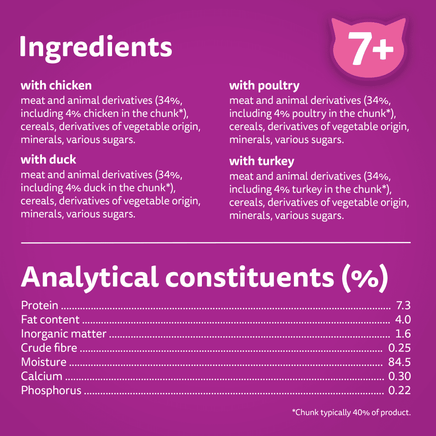 With Chicken Analytical constituents (%): Protein: 7.3, Fat content: 4.0, Inorganic matter: 1.6, Crude fibre: 0.25, Moisture: 84.5, Calcium: 0.30, Phosphorus: 0.22, Additives per kg:, Nutritional additives:, Vitamin B₁: 27.3 mg, Vitamin B₂: 1.4 mg, Vitamin B₆: 4.6 mg, Vitamin C: 702 mg, Vitamin D₃: 200 IU, Vitamin E: 138 mg, Taurine: 1101 mg, Copper (Copper(II) sulphate pentahydrate): 1.2 mg, Iodine (Calcium iodate, anhydrous): 0.28 mg, Iron (Iron(II) sulphate monohydrate): 14.0 mg, Manganese (Manganous sulphate, monohydrate): 2.8 mg, Zinc (Zinc sulphate, monohydrate): 16.2 mg, Sensory additives:, Flavourings With Duck Analytical constituents (%): Protein: 7.3, Fat content: 4.0, Inorganic matter: 1.6, Crude fibre: 0.25, Moisture: 84.5, Calcium: 0.30, Phosphorus: 0.22, Additives per kg:, Nutritional additives:, Vitamin B₁: 27.3 mg, Vitamin B₂: 1.4 mg, Vitamin B₆: 4.6 mg, Vitamin C: 702 mg, Vitamin D₃: 200 IU, Vitamin E: 138 mg, Taurine: 1101 mg, Copper (Copper(II) sulphate pentahydrate): 1.2 mg, Iodine (Calcium iodate, anhydrous): 0.28 mg, Iron (Iron(II) sulphate monohydrate): 14.0 mg, Manganese (Manganous sulphate, monohydrate): 2.8 mg, Zinc (Zinc sulphate, monohydrate): 16.2 mg, Sensory additives:, Flavourings With Poultry Analytical constituents (%): Protein: 7.3, Fat content: 4.0, Inorganic matter: 1.6, Crude fibre: 0.25, Moisture: 84.5, Calcium: 0.30, Phosphorus: 0.22, Additives per kg:, Nutritional additives:, Vitamin B₁: 27.3 mg, Vitamin B₂: 1.4 mg, Vitamin B₆: 4.6 mg, Vitamin C: 702 mg, Vitamin D₃: 200 IU, Vitamin E: 138 mg, Taurine: 1101 mg, Copper (Copper(II) sulphate pentahydrate): 1.2 mg, Iodine (Calcium iodate, anhydrous): 0.28 mg, Iron (Iron(II) sulphate monohydrate): 14.0 mg, Manganese (Manganous sulphate, monohydrate): 2.8 mg, Zinc (Zinc sulphate, monohydrate): 16.2 mg, Sensory additives:, Flavourings With Turkey Analytical constituents (%): Protein: 7.3, Fat content: 4.0, Inorganic matter: 1.6, Crude fibre: 0.25, Moisture: 84.5, Calcium: 0.30, Phosphorus: 0.22, Additives per kg:, Nutritional additives:, Vitamin B₁: 27.3 mg, Vitamin B₂: 1.4 mg, Vitamin B₆: 4.6 mg, Vitamin C: 702 mg, Vitamin D₃: 200 IU, Vitamin E: 138 mg, Taurine: 1101 mg, Copper (Copper(II) sulphate pentahydrate): 1.2 mg, Iodine (Calcium iodate, anhydrous): 0.28 mg, Iron (Iron(II) sulphate monohydrate): 14.0 mg, Manganese (Manganous sulphate, monohydrate): 2.8 mg, Zinc (Zinc sulphate, monohydrate): 16.2 mg, Sensory additives:, Flavourings -
