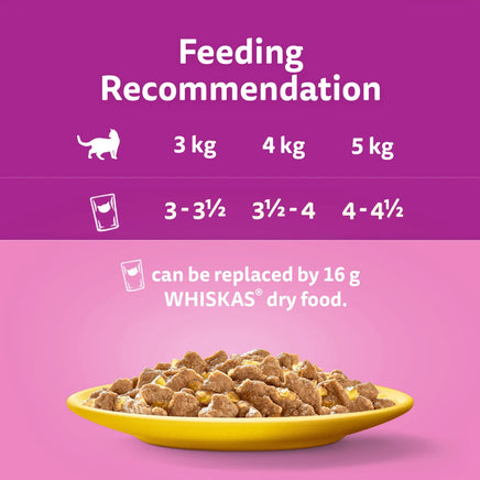 WHISKAS® 7+ Poultry Feasts adult cat food pouches in jelly are specially prepared to preserve the natural goodness and deliciousness of high quality ingredients and will see your cat rush to the bowl faster than ever before! Made with sustainably sourced ingredients, these cat food pouches contain everything your cat needs to keep them happy and healthy.100% high quality ingredients. All of your 7+ cat's daily needs. 12 x 85g pouches.Menu- with Chicken- with Duck- with Poultry- with TurkeyAs cat lovers, we know that purring is the best sound you can hear. That’s why our feline chefs work hard to create delicious meals that make millions of cats around the world rush to their bowls with purring excitement and lickingly-good satisfaction. Prepared with love and care, each dish is nutritionally balanced to ensure your cat has everything they need to keep them purring. Complete wet pet food for senior cats.