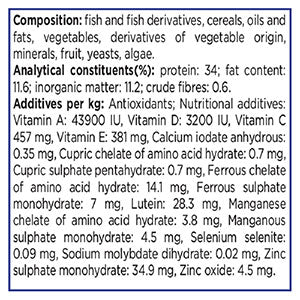Protein 34%, Crude Fibres 0.6%, Crude Oils and Fats 11.6%, Crude Ash Not stated, Moisture Not stated