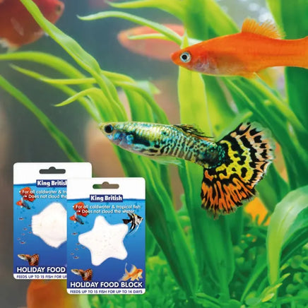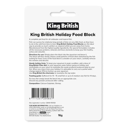 In the wild, fish can survive for relatively long periods of time on very little food. King British Holiday Food Blocks provide fish with as much nutrition as required, only releasing small particles of food when fish feed.How to use