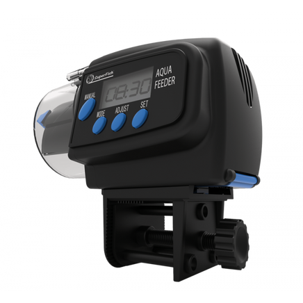 Automatic Fish Food dispenser. Great to feed everyday at regular times or ideal to keep feeding during your holidays. This microprocessor controlled feeder can feed between 1 and 4 times daily. It's driven by two AA batteries and can be easily installed on top of your aquarium.