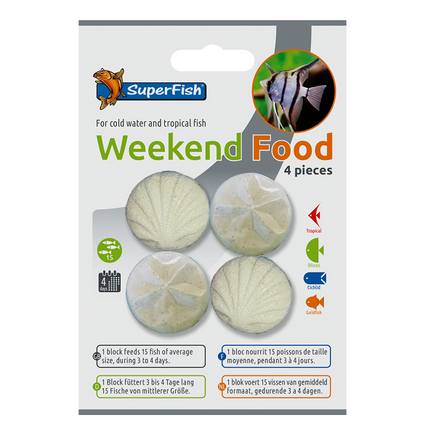 The Weekend Food is sufficient food for about 15 fish, for 3 to 4 days and the Holiday Food lasts 2 weeks.