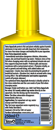 Tetra AquaSafe is ideal for using during water changes and when setting up a new aquarium as it makes tap water safe for fish within a matter of seconds: it removes any harmful substances in the water, such as chlorine, chloramine, copper zinc and lead, immediately and thoroughly. What’s more, its vitamin B mix reduces any stress that fish may experience during water changes. The product contains a natural plant extract to protect fish gills and mucous membranes, thereby promoting long-term health. The optimized care formula is perfectly tailored to the special care needs of fishes’ skin and fins. Furthermore, Tetra AquaSafe contains other essential vitamins, iodine and magnesium. Iodine supports vitality while magnesium promotes the growth and well-being of fish and plants. The care product also encourages the settlement and bioactivity of useful bacteria in the aquarium, which in turn ensure clean, healthy water. Tetra AquaSafe dissolves quickly in the aquarium water and offers long-term health benefits for all aquarium inhabitants. It is suitable for all freshwater and marine aquariums and is recommended whenever setting up a new aquarium or carrying out a water change. Tetra AquaSafe instantly makes tap water safe for fish and provides the ideal basis for a healthy life in an aquarium. When using Tetra AquaSafe in marine aquariums, however, the protein skimmer should be switched off to prevent large amounts of foam from forming.