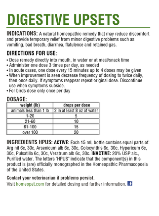 INDICATIONS: A homeopathic remedy that may reduce discomfort and provide temporary relief from minor digestive problems such as vomiting, bad breath, diarrhoea, flatulence and retained gas.