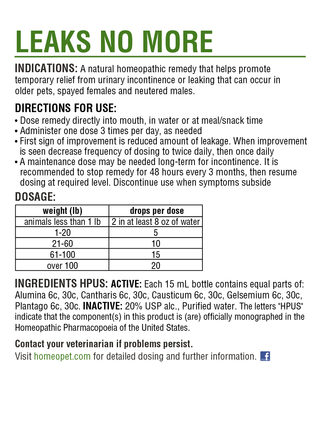 INDICATIONS: A homeopathic remedy that helps promote temporary relief from urinary incontinence or leaking that can occur in older pets, spayed females and neutered males.