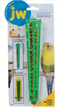 JW Pet Company Millet Spray Holder is an easy way to offer your bird millet. Attaches to the cage easily. All plastic. Designed for a birds well-being. Can be placed inside of the Insight Treat Stick Holder.